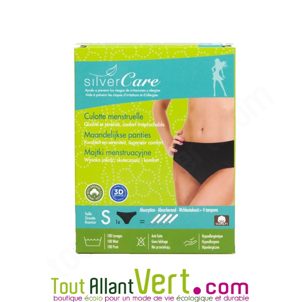 Culotte menstruelle lavable et réustilisable en coton 100% bio. Hypoallergénique. Possède un bon maintien et capacité ultra absorbante. Marque Silver Care. Taille S, 36-38. Coloris Noir. Jusqu'à 100 lavages. Marque Silver Care