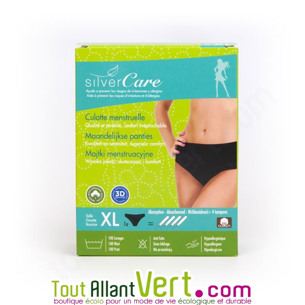 Culotte menstruelle lavable et réustilisable en coton 100% bio. Hypoallergénique. Possède un bon maintien et capacité ultra absorbante. Taille XL, 48/50. Coloris Noir. Jusqu'à 100 lavages. Marque Silver Care