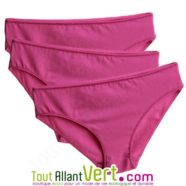 ★ ★ ★ ★ ★1 avis clients3 culottes en 100% coton biologique. Grande douceur et confortable. Taille S. Lot de 3 culottes fuchsia. Coton bio certifié GOTS par Ecocert. Traitements et finitions textiles écologiques. Fabriqué en Turquie de manière responsable.
