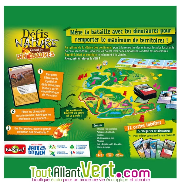 Défis Nature Grand jeu Dinosaures, partez à la découverte des dinosaures au rythme de la dérive des continents et de la chute d’une météorite géante. Menez la bataille avec vos dinosaures pour remporter le maximum de continents ! 77 cartes inédites dans ce jeu ! A partir de 7 ans. De 2 à 5 joueurs. 30 minutes de jeu. Jeu fabriqué en France.