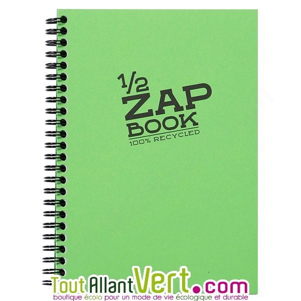 Bloc spirale uni recyclé 160 pages, Demi ZapBook, A5, couverture verte.Un bloc à spirale 100% recyclé pour les baroudeurs !