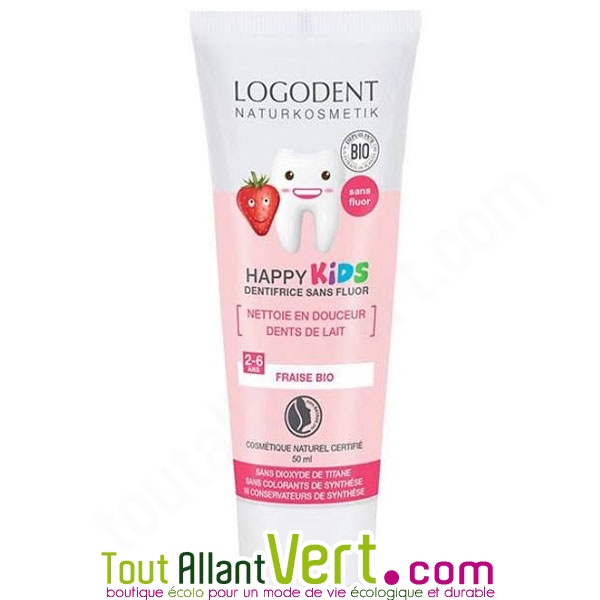 Dentifrice enfant à la fraise. Il nettoie en douceur les dents de lait. Pour enfant de 2 à 6 ans, ce dentifrice bio s'utilise dès l'apparition des premières dents de lait pour des dents fortes et saines. Sans fluor, aux extraits de plantes bio. Certifié cosmétique naturel. 50ml. Marque Logona