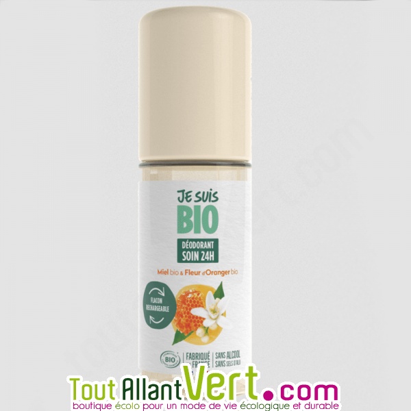 de Je Suis BIODéodorant roll on à bille textute crémeuse sans alcool, à base d'huile de coco bio parfumée au Miel et à la Fleur d'oranger. Efficace 24h . Parfum 100% d'origine naturelle. Flacon rechargeable. Certifié Cosmétique bio 50ml. Fabriqué en France. Marque Je suis bio.