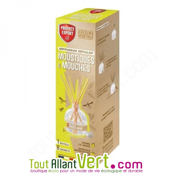 Diffuseur pour faire fuir moustiques, moustique tigre et mouches. Si vous avez envie d'être tranquille, alors ce flacon est fait pour vous, surtout qu'il a un aspect esthétique indéniable! Convient pour une pièce de 12 m² pendant 15 jours. Contient 1 bouteille de 60ml et 8 batonnets. Efficace dès 24 heures de diffusion. Composition à base végétal, parfum floral. Fabriqué en France.