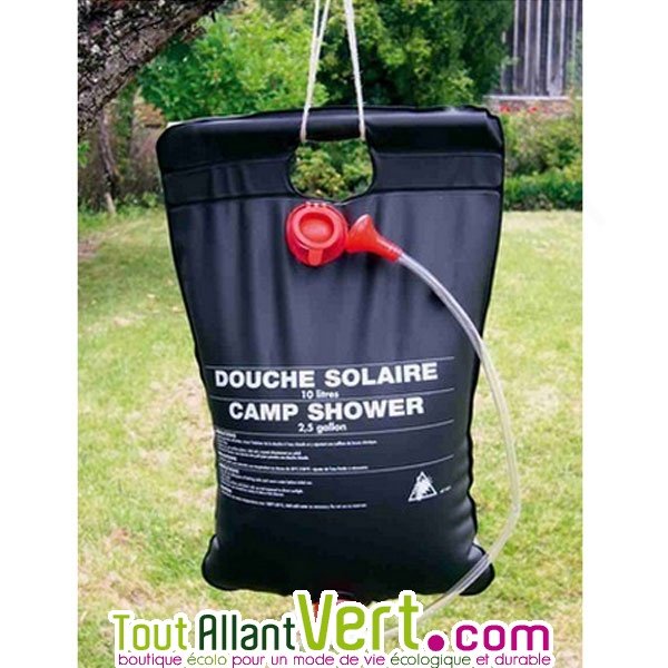 Exposée au soleil sur son côté noir, la douche solaire permet de chauffer en quelques heures l'eau dont on l'a remplie.