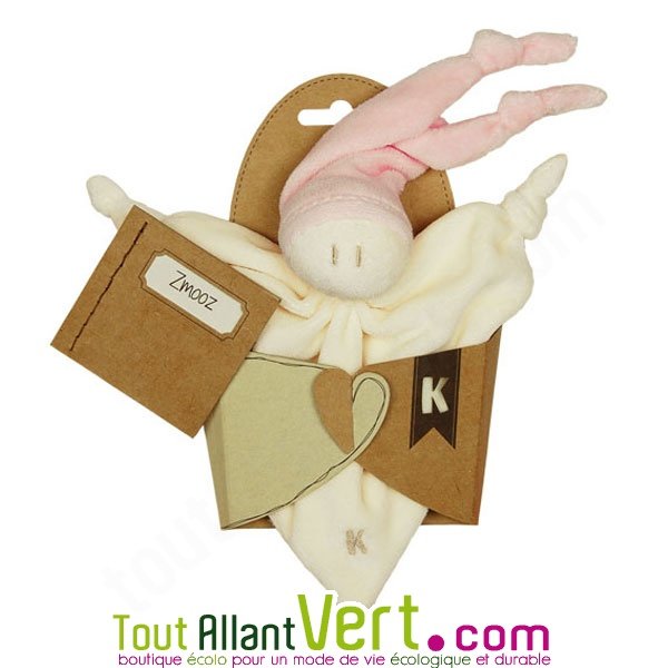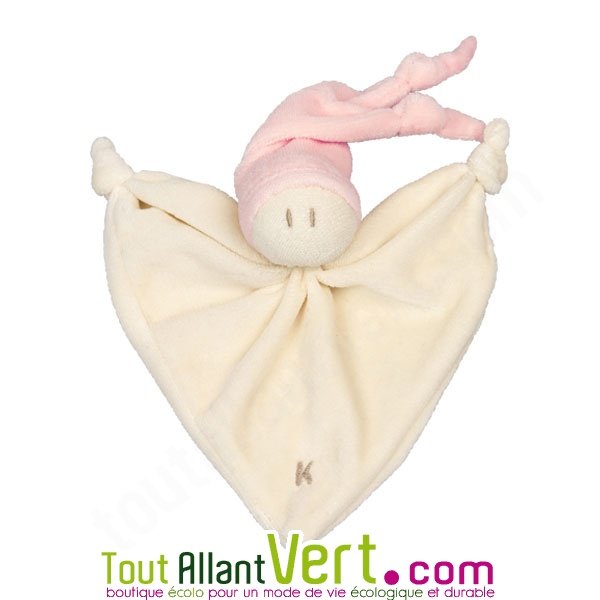 Ce doudou convient dès la naissance. En coton biologique avec un bonnet Rose Pastel, il est sûr, sain, doux et comporte des petits noeuds pour que les petites mains de bébé puissent bien l'agripper. Très doux, il a un visage simple qui favorise l'imagination des enfants. 17 cm (sans les oreilles du bonnet) - 26 cm (avec les oreilles du bonnet).