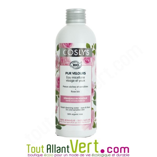 Eau micellaire Nettoyante et Démaquillante, spécial peaux sèches de Coslys.A l'extrait de rose bio, cette eau micellaire protège et apaise les peaux sèches et sensibles. Votre peau est nettoyée, douce et apaisée, sans rinçage !