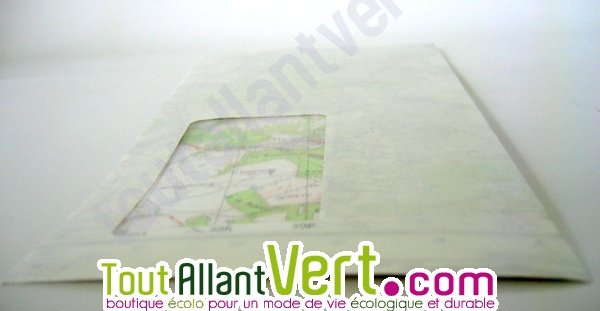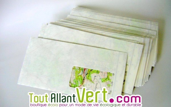 Ces enveloppes sont directement confectionnées à partir de papiers récupérés (carte d'états majors, papier de l'industrie, calendriers...). Une idée originale et innovante qui économise l'eau et l'énergie nécessaires à la fabrication traditionnelle du papier recyclé !