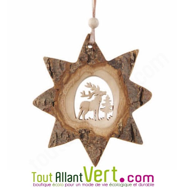 • Etoile en bois avec cerf découpé dans un tronc d\'arbre, suspension pour Noël