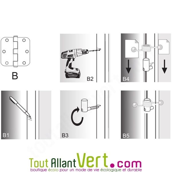 Pour les portes de type B, si vous ne pouvez pas mettre le ferme-porte dans le gond, il faut utiliser la vis fournie. Prépercer un trou de 3 à 6 cm de diamètre 6mm dans le cadre à 1.5cm de la commisure de la porte. Installer la vis qui va se substituer au gond d'une porte de type A. Répetez ensuite les étapes pour la porte de type A pour insérer le ferme-porte.