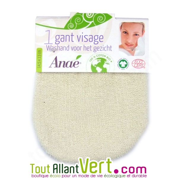 Gant du visage en coton 100% bio. Permet le démaquillage et le soin du visage. Certification GOTS. Dimensions 14.5x13 cm. Fabrication Européenne.