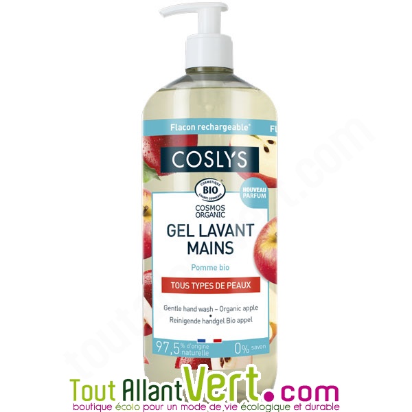 Gel lavant bio gourmand spécial mains, sans savon, 1 Litre, CoslysAvec son parfum gourmand de pomme bio, ce gel lavant spécial mains nettoie en douceur sans assécher la peau. Sa formule sans savon contient de l'eau florale de reine des prés bio, aux vertus apaisantes.