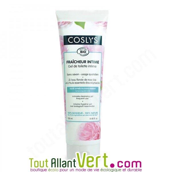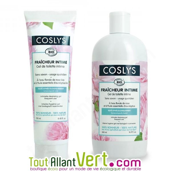 Gel intime COSLYS, à l'eau florale de rose bio, Infinie Douceur. Existe en 250 ml et 500 ml.L'eau florale de Reine des Près et de Rose bio sont reconnues pour leurs propriétés anti-inflammatoires et apaisantes. Quelques gouttes sur le gant de toilette, pour un lavage externe très doux. Sans savon, ni antiseptique, un pH est de 5,5. Ce gel préserve la flore vaginale et respecte votre épiderme délicat avec une sensation de fraîcheur pour vous sentir bien toute la journée.
