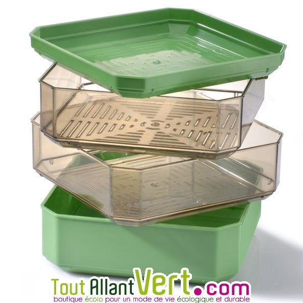 Les 2 plateaux de germinations sont percés de trous. Ils s'emboitent les uns dans les autres pour vous permettrent de faire germer en un espace restreint plusieurs sortes de graines. L'égouttoir du fond sert à recevoir l'eau résiduel. Le couvercle est également percé de trou pour une bonne aération des graines.