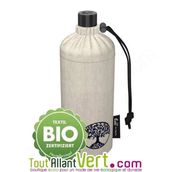Gourde écologique, en verre ultra résistant avec système breveté 3 couches. Idéal pour eau fraîche mais aussi café, thé, chocolat et autres boissons chaudes.Modèle: Habillage textile 50% coton bio 50% lin bio certifié. Coloris naturel. Capacité 60cl.