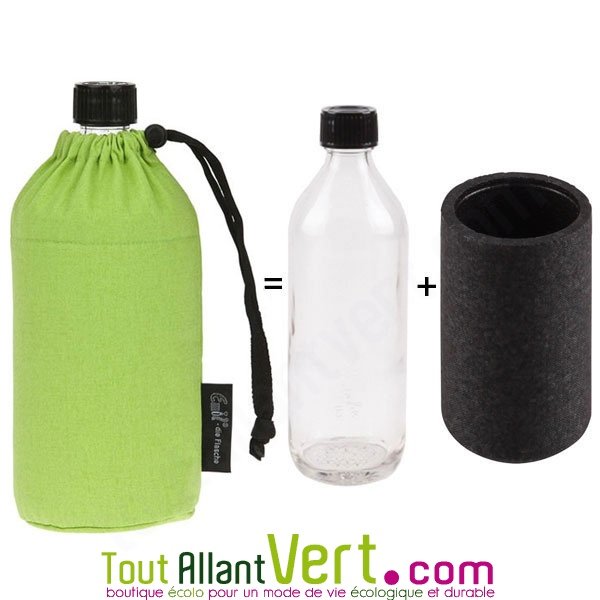 Gourde écologique, en verre ultra résistant avec système breveté 3 couches. Idéal pour eau fraîche mais aussi café, thé, chocolat et autres boissons chaudes.Modèle: Vert pomme, textile coton 100% certifié biologique. Capacité 60cl - Poids : 430 grammes environ.