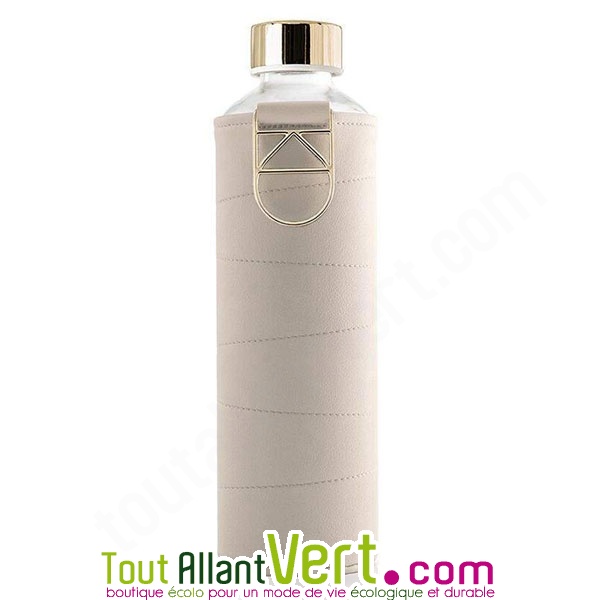 Une bouteille en verre de 750ml dans un fourreau en faux cuir beige avec boucle mettalique. Un mélange atypique, mais sain et naturel ! 100% étanche. Bouchon à visser. Saine et sûre, sans Bisphénol A, ni produits chimiques. Elle convient pour tous types de boissons, même chaude. Passe au lave-vaisselle. Idéal au bureau, en ville, en balade... Fabriqué en Europe.