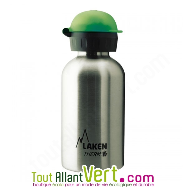 de LakenGourde saine et sûre (gourde inox et bouchon polypro garantis sans produit toxique ni Bisphénol A). Housse de protection OVNI. Isotherme (Garde les boissons froide 24h ou chaude 12h). Capacité 0,35l. Bouchon enfant vert 100% étanche et hermétique. Très résistante, vous la conserverez longtemps. Convient à tous types de boissons, même gazeuse. Fabriqué par Laken