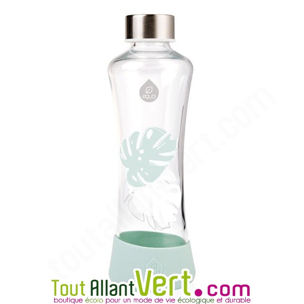 Jolie bouteille en verre de la marque Equa, décorée de feuilles de Monstera et d'un fond en silicone verre pastel. Soyez à la mode avec ce motif tout droit venu des tropiques sur votre gourde !