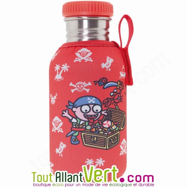 Gourde enfant inox 0,5L avec housse rouge illustrée pirate bouchon à visser.- Inox : sain, solide et durable