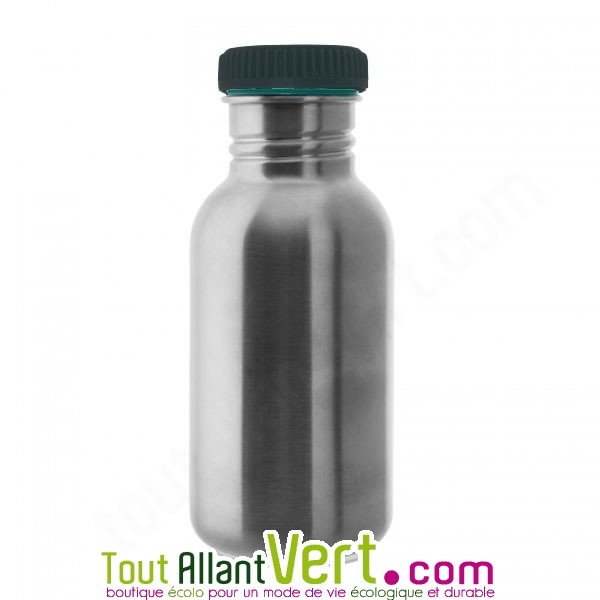 de LakenGourde 500ml inox pour enfant. Légère (160g) et solide. Saine : bouchon à visser et gourde inox garantis sans produit toxique ni Bisphénol A. Livrée avec une jolie housse de protection en néoprène verte illustrée. Cordon d'accroche scratch. Gourde couleur inox sans motif. Durable, elle convient à tous types de boissons, même gazeuse. Fermeture hermétique 100% étanche. Fabriqué par Laken