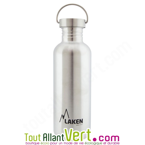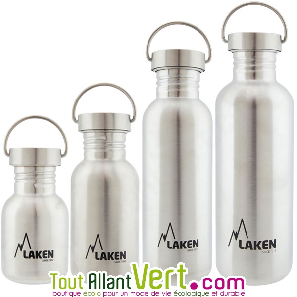 de LakenGourde 100% inox. Bouchon inox à visser avec joint silicone. Fermeture hermétique et 100% étanche. Légère et solide. Saine et sûr, l'inox ne nécessite aucun revêtement. Garanti sans produit toxique ni Bisphénol A. Durable, elle convient à tous types de boissons, même gazeuse. Fabriqué par Laken. Taille au choix : 350ml, 500ml, 750ml ou 1 litre.
