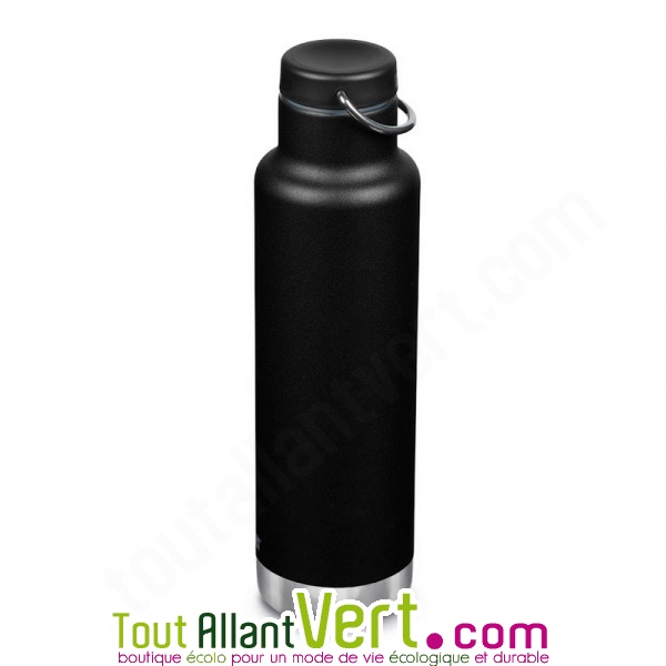 Bouteille isotherme en acier inoxydable de qualité, coloris noir. 592mL. Garde les boissons chaudes 24h et froides 63h. Bouchon anneau à visser. Garantie sans BPA. Passe au lave-vaisselle. Marque Klean Kanteen, modèle Insulated Classic.