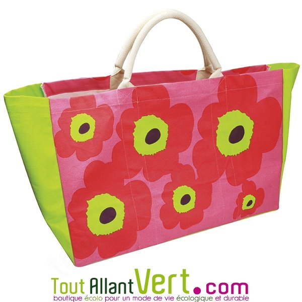 Grand sac cabas coton biologique Fleurs, 50x35 cm.Très coloré, ce sac extra large en coton bio et solidaire est idéal pour le marché, le shopping, les week-end, la plage, le pique-nique, le rangement des jouets... Large soufflet de 20 cm pour une forme très généreuse.