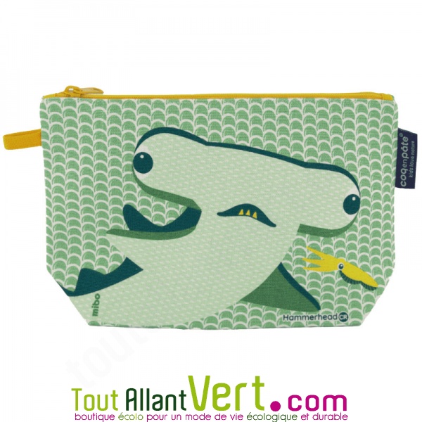 de Coq en PâteGrande trousse 13 x 22 cm fabriquée en coton bio. Requin marteau sur fond de vagues vertes. Avec un soufflet de 6 cm qui permet d'y metttre toutes les affaires d'école. Fermeture éclair jaune. Finitions soignées et résistantes. Idéale pour l'école ou la maison ! Marque Coq en Pâte.