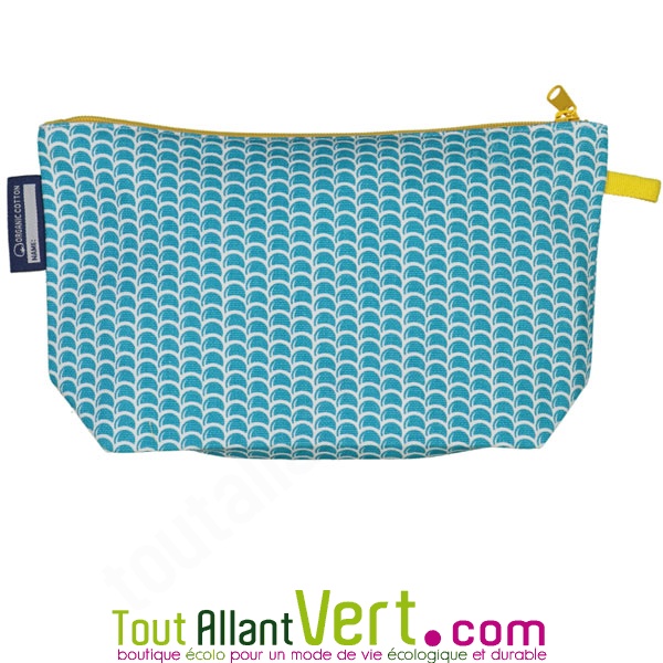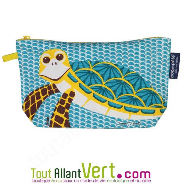 de Coq en PâteGrande trousse à soufflet de 6 cm en coton bio. La tortue nage sur le fond imprimé turquoise. Finitions soignées et résistantes. Fermée par une fermeture éclair jaune. 13 x 22 cm. Idéal pour ranger tout ce qu'il faut pour l'école.