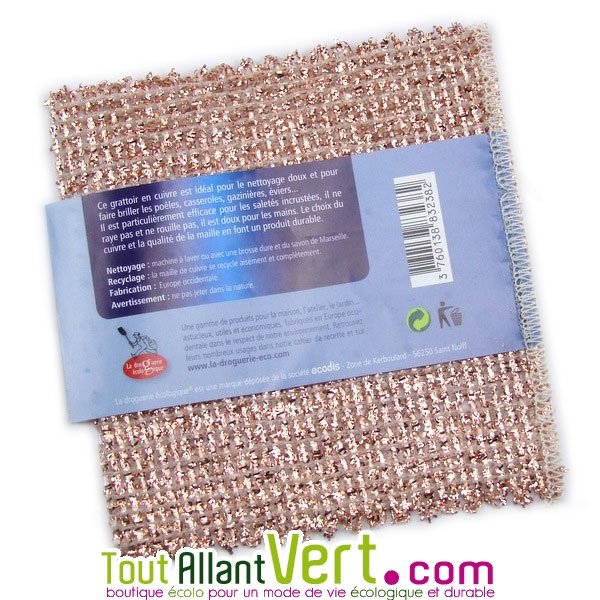 Le choix du cuivre et la qualité de la maille font de ce grattoir un produit durable. La maille de cuivre se recycle aisément et complètement en fin de vie.
