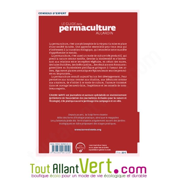 Un livre pour découvrir les principes de la permaculture et aménager son jardin.Présentation de l'éditeur: Ode de culture mais aussi philosophie de vie, la permaculture est fondée sur une fine observation de la nature avec un objectif de grande productivité. Ce guide, irrigué par l'expérience de pionniers ayant expérimenté cette démarche en France et en Belgique, nous initie à ses méthodes. Pour des récoltes abondantes, y compris en ville !