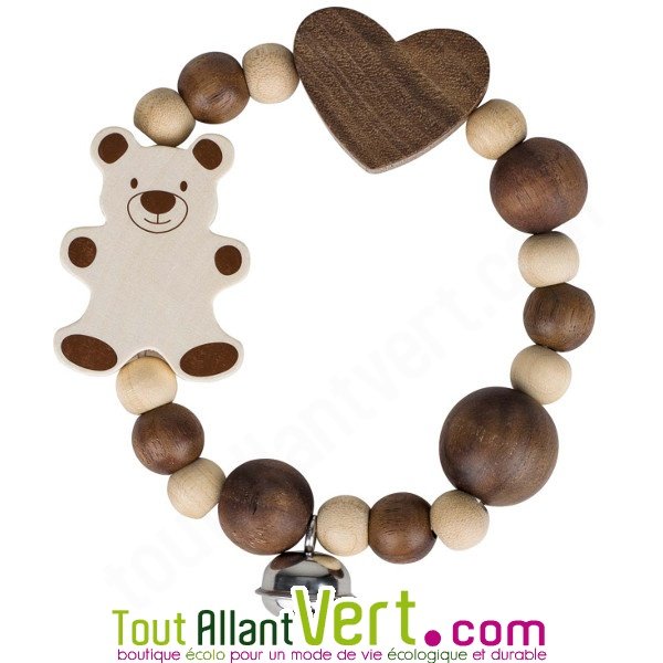 Hochet bois naturel avec clochette, coeur et ours.- Diamètre: 9.5 cm