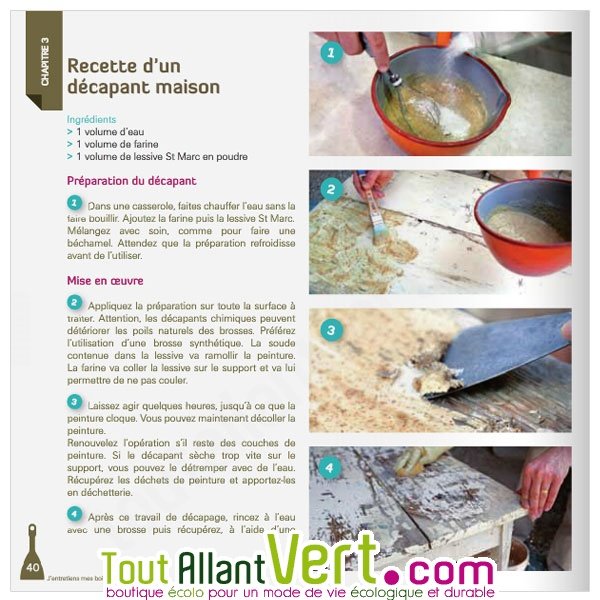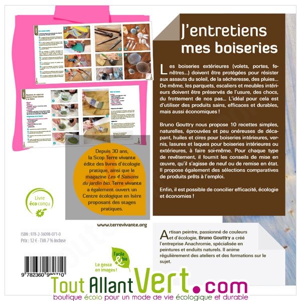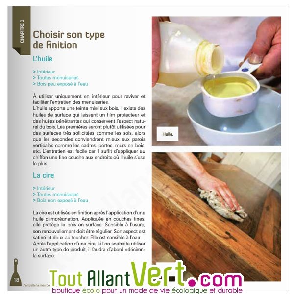 Vous trouverez 10 recettes simples, naturelles et testées à faire soi-même de décapant, huiles, cires pour les boiseries intérieures, vernis, lasures ou laques pour les boiseries intérieures ou extérieures. Vous trouverez également des comparatifs d'achat de produit prêt à l'emploi (laques, lasures, huiles, vernis...) et bien sûr tous les conseils de mise en oeuvre dans les règles de l'art, pour de l'ancien ou du neuf.