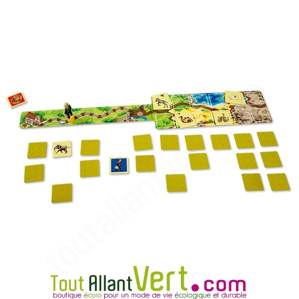 Jeu de memory coopératif dès 5 ans, de 1 à 8 joueurs, durée moyenne de 15 minutes de jeu. Objectif: Ramener des animaux du zoo échappés de leurs enclos et les ramener à bon port, avant que le directeur ne s'en aperçoive!