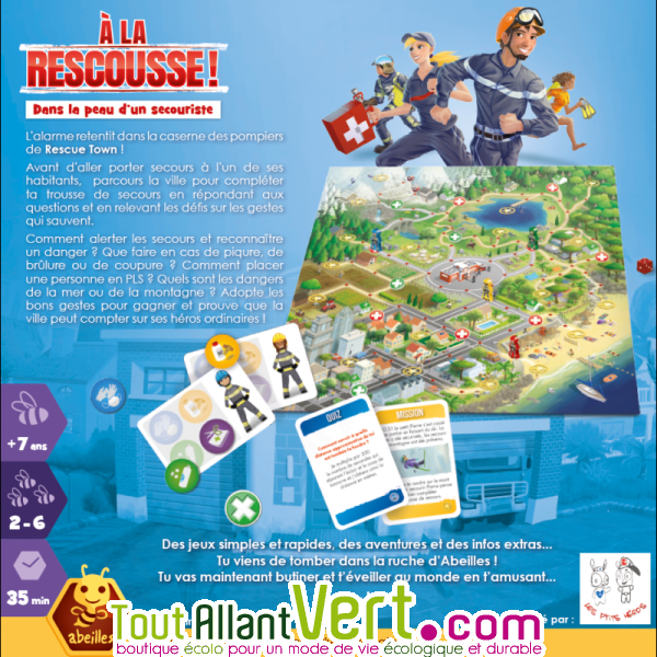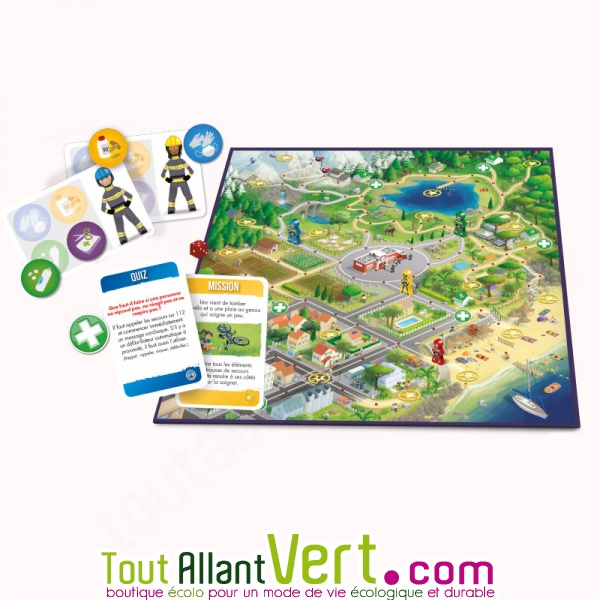 À travers ce jeu de plateau, l’enfant doit sauver les habitants de la ville de Rescue Town, en associant danger, accident et précaution à prendre. Il acquiert ainsi les bons réflexes de situations courantes de la vie. Pour gagner, soit le premier à compléter ta trousse de secours.