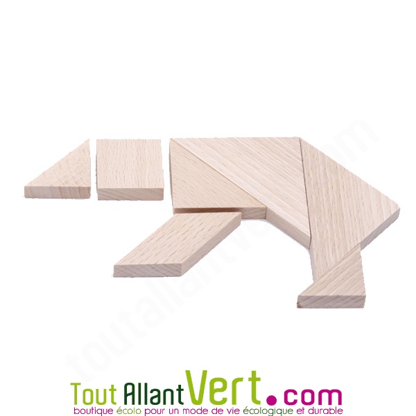 Ce jeu de tangram en bois naturel permet avec 7 pièces en bois naturel du Jura de constituer des formes géométriques représentant des objets, des animaux, des personnages, des formes géométriques. Permet de développer l'imagination, la logique, le repère dans l'espace. Fabriqué en France. Livret de 28 figures inclus.