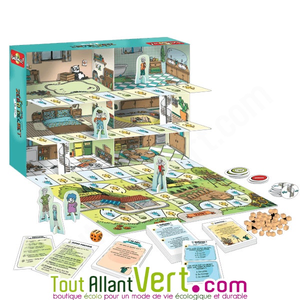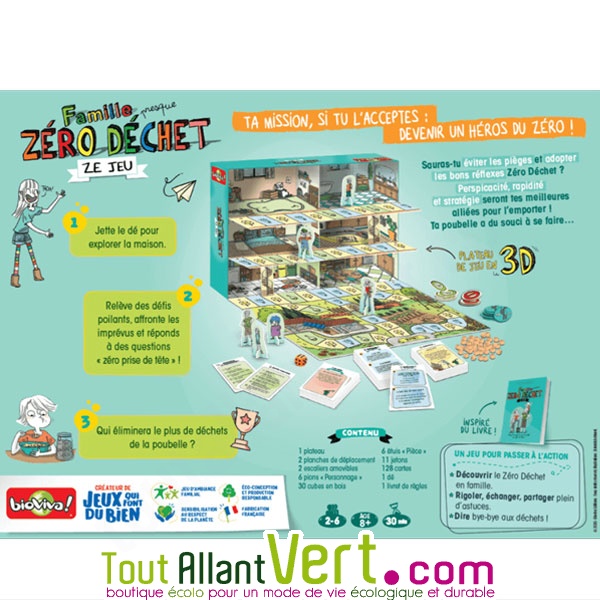But du jeu : Votre mission si vous l'acceptez devenir des héros du zéro! Rigolez ensemble autour de 3 épreuves drôles et décalées (défis, questions-réponses et aléas) et partager pleins d'astuces afin de dire bye-bye aux déchets! A partie de 8 ans. De 2 à 6 joueurs. 30 minutes de jeu. Jeu fabriqué en France.