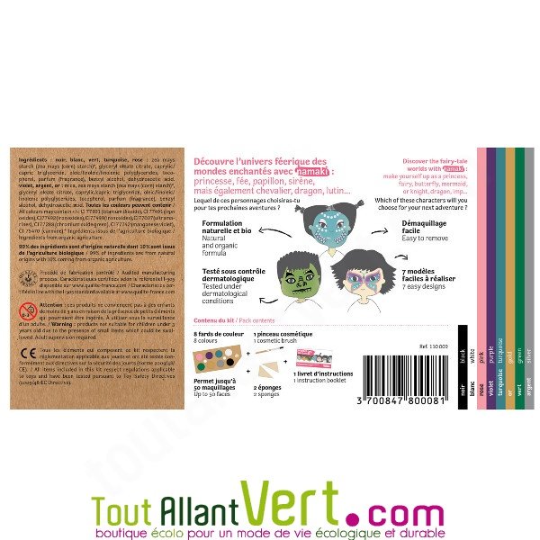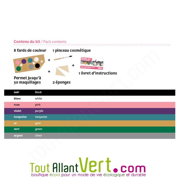 Maquillage bio pour enfants sur le thème des "Mondes enchantés". Palette de 8 couleurs constituées de matières premières naturelles testées sous contôle dermatologique. Kit avec 8 couleurs, 2 éponges, 1 pinceau et un livret pour faire 7 exemples différents). Permet de réaliser jusqu'à 50 visages avec ce kit !