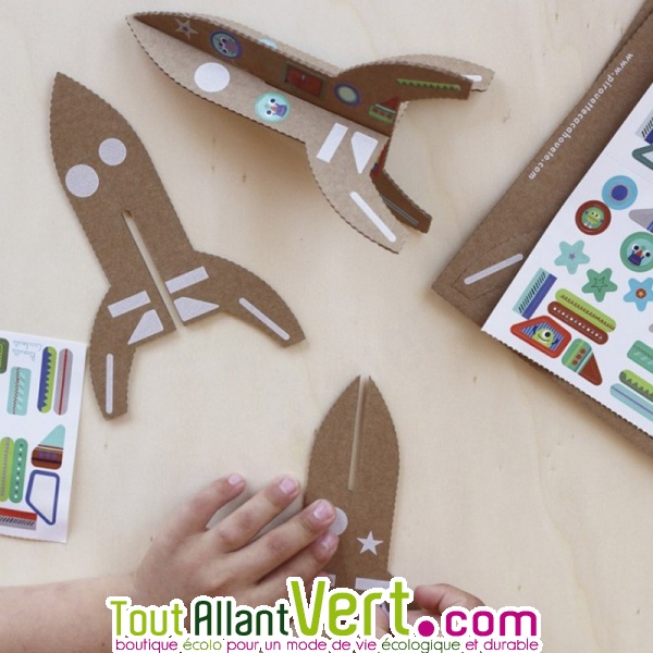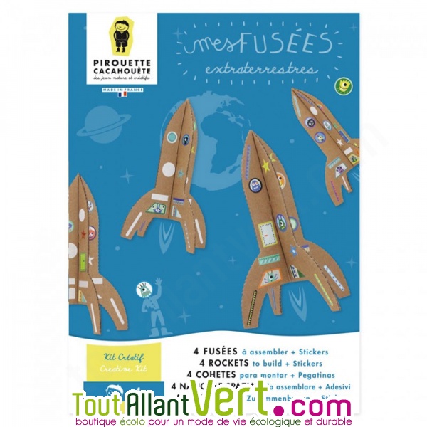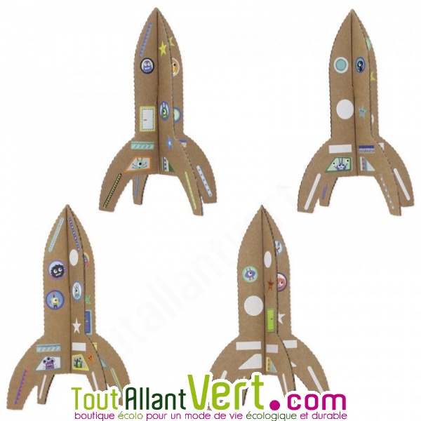 Kit créatif : 4 fusées en carton à assembler et à décorer avec les 120 stickers. Pas besoin de colle, ni de ciseaux ! Votre enfant pourra laisser libre cours à son imagination en donnant vie à de magnifiques constructions naturelles ! Dès 4 ans. Fabriqué en France