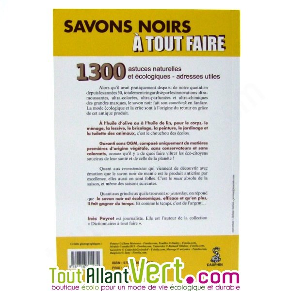 - Le livre "Savons noirs à tout faire, 1300 trucs et astuces naturels et écologiques" pour être sûr que vous connaissiez tout sur le savon noir et ses multiples usages. (Livre de Ines Peyret de 270 pages). Ce livre est une mine d'informations, de recettes. Une lessive, une tâche, un sols spécial à laver... quelle dose utiliser, comment utiliser le savon noir ? Pour chaque moment de nettoyage, vous trouverez la réponse à vos questions dans ce livre.