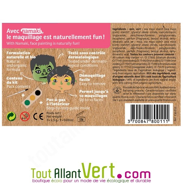 - la transparence, le respect et la confiance que l'on retrouve dans leur produit : Les maquillages Namaki sont sans danger pour les enfants et les parents car composés exclusivement de matières naturels. Hypoallergéniques et certifiés bio, les maquillages ont été testé dermatologiquement et cliniquement.