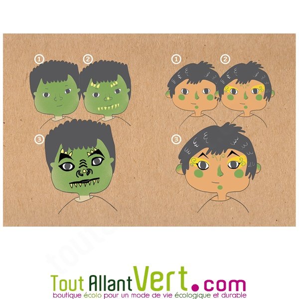 Ce kit de maquillage pour enfants est bio et naturel. Enfin du maquillage pour enfants bons pour la santé et bons pour l'environnement. Il permet de devenir, un Dragon, un Lutin ou tout autre personnage avec les couleurs Or, noir et Vert.Un maquillage bio pour enfants!