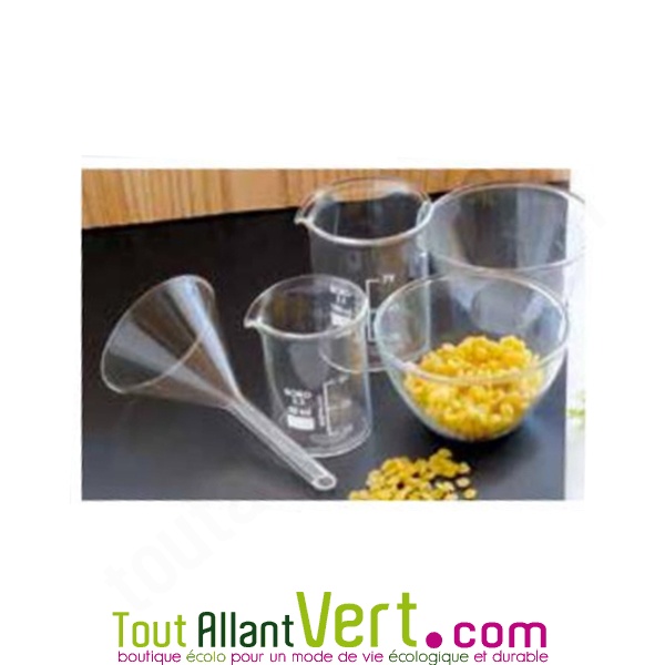 Ce kit contient le matériel de base pour doser, mélanger et transférer vos recettes de cosmétiques maison. Inclus: 2 béchers, 2 bols et 1 entonnoir. En verre borsolicate, matériau inerte utilisé en laboratoire.