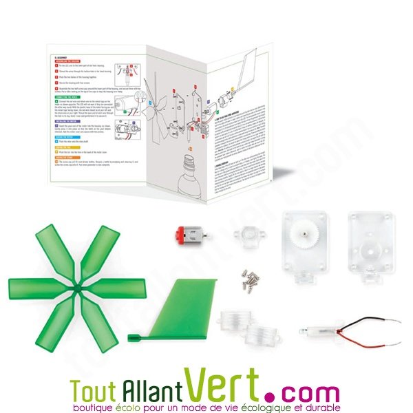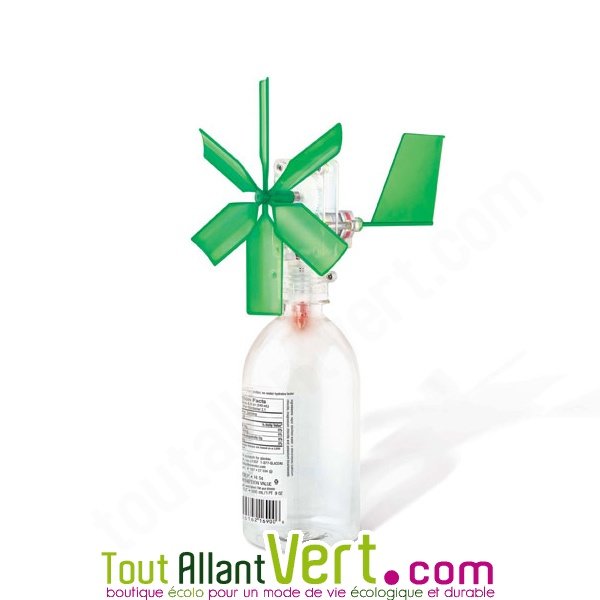 Ce jeu pédagogique pour les 8 ans et + permet de construire sa propre mini éolienne, à partir d'une bouteille usagée qui pourra servir de pied. Une LED s'allume grâce à l'énergie produite par le vent (sans aucune batterie).