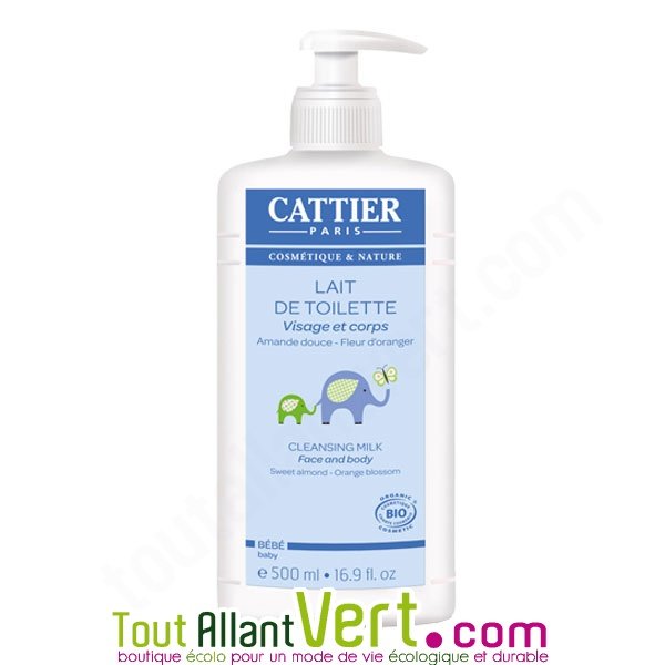 Lait de toilette bébé visage et corps à l'amande douce bio et au calendula bio, 500ml. Il apporte une grande douceur à la peau de bééb. Certifié bosmétique biologique. Marque Cattier. Fabriqué en France.