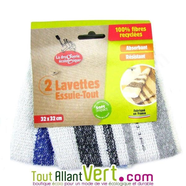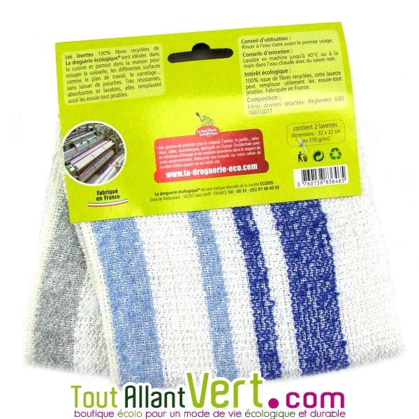 Lot de 2 lavettes recyclées.- Recyclées, elles remplacent l'essuie-tout jetable