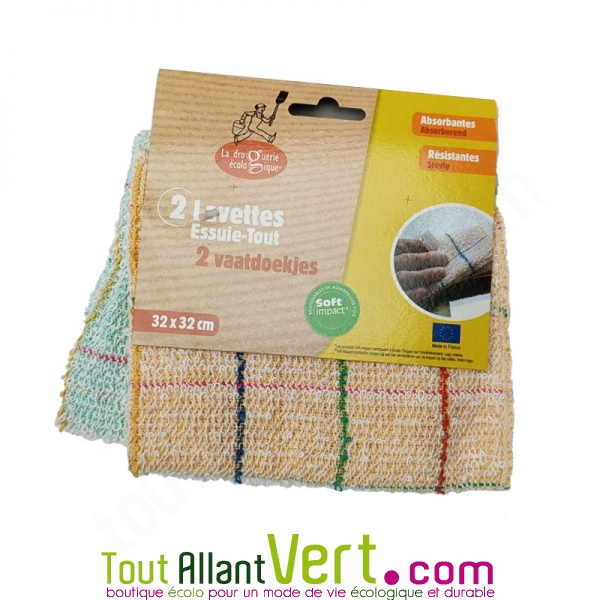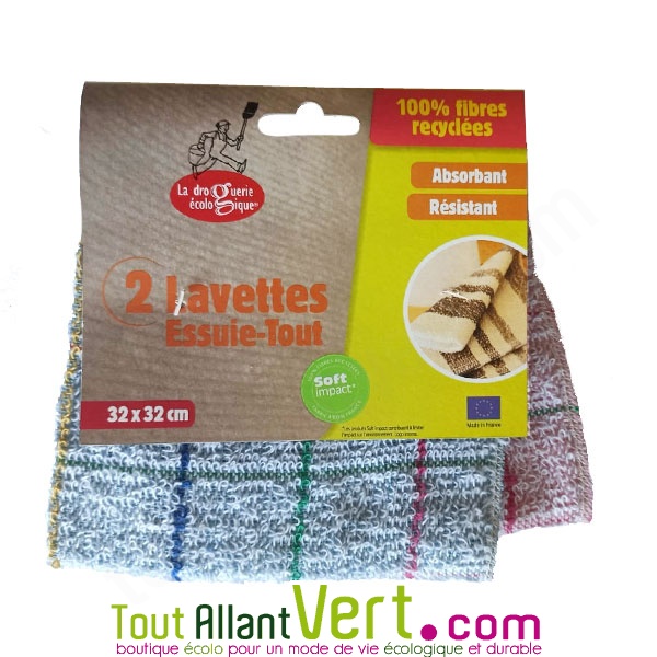 Lot de 2 lavettes recyclées absorbantes et résistantes. Utiles dans toute la maison, non pelucheuses, elles sont lavables en machine. Elles remplacent les essuie-tout jetables et nettoient toutes les surfaces de la cuisine, salle de bain, salle à manger... 32 cm x 32 cm. Fabriqué en France.