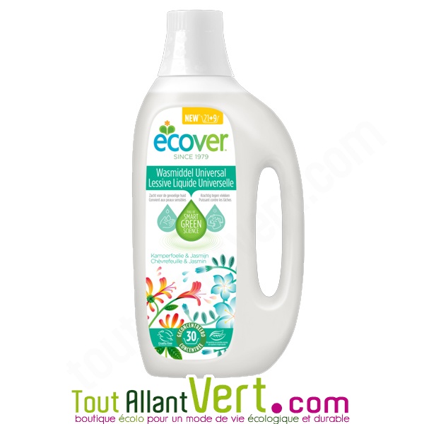 de EcoverLessive liquide linge, senteur Chèvrefeuille et Jasmin. Pour le blanc et les couleurs, efficace, même à 30°c. Une lessive qui respecte notre peau (sans azurants optiques, parfum uniquement d'origine végétale...) et notre environnement (biodégradabilité maximale, impact minimal sur la vie aquatique). Bidon de 1,5 litre. Marque Ecover. Convient aux peaux sensibles. Pas test sur animaux. Ingrédients d'origine naturelle.