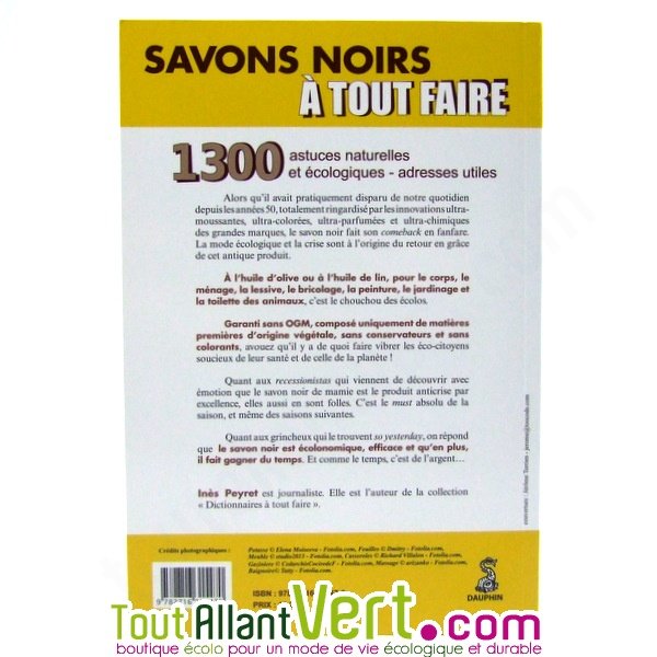 Le savon noir fait son retour en fanfare. La mode écologique et la crise sont à l'origine du retour en grâce de cet antique produit. En effet, il est simple, biodégradable et économique à l'usage ! En plus il est efficace et multi-usages.Pour connaître tous ses usages possibles, son origine, ses vertus, ses propriétés, l'utiliser au mieux et faire des économies, l'auteur Inès Peyret, spécialiste des "Dictionnaires à tout faire" vous propose 1300 trucs et astuces pour l'employer : entretien des sols, nettoyage de la cuisine et des ustensiles, faire scintiller la salle de bain, laver le reste de la maison, en passant par les tapis, moquettes et les meubles, faire la lessive, le bricolage et les travaux, l'utiliser au jardin et pour la lutte anti-nuisibles, l'hygiène corporelle et le hammam et les soins de peaux, pour guérir quelques petits bobos, et finalement son usage pour nos amis les animaux.